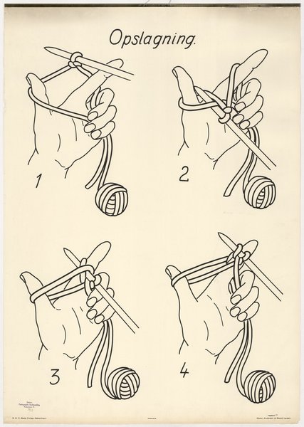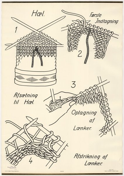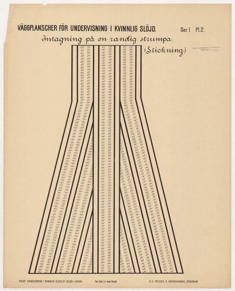 42002 - Hulda Lundine: Väggplanscher för undervisning i kvinnlig slöjd I,2: Intagning på en vanlig strumpa (Strickning)